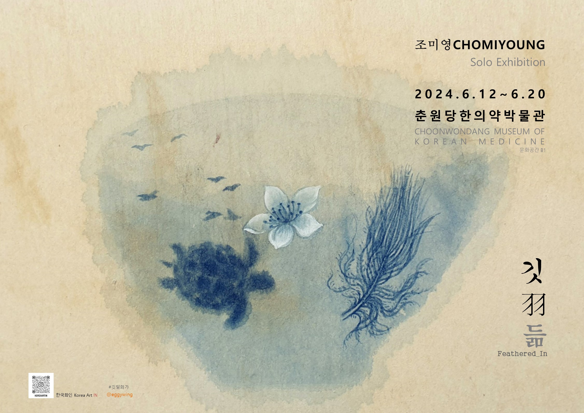 조미영CHOMIYOUNG Solo Exhibition 깃羽듦Feathered_In 2024.6.12-6.20춘원당한의약박물관 문화공간B1CHOONWONDANG MUSEUM OF KOREAN MEDICINE 춘원당한의약박물관은 바쁜 일상 속 여유를 찾아 조화로운 삶을 추구하는 ‘겟생:GET+生’에 착안하여 서로의 몸과 마음이 회복될 수 있는 전시를 조미영 작가와 함께 선보입니다.조미영 작가의 깃羽듦>이 추구하는 방향은 우리 의학이 추구하는 방향과 비슷합니다. 한의학이 오랜 과거로부터 현재까지 이어 오고 있는 독자적인 의학이듯이, 조미영 작가도 전통 기법을 기반으로 깃羽을 독자적으로 재해석합니다. 한의학이 자연의 이치를 인체에 투영하여 질병의 원인을 찾고 치료하듯이, 조미영 작가도 자연 속에서 끊임없이 ..